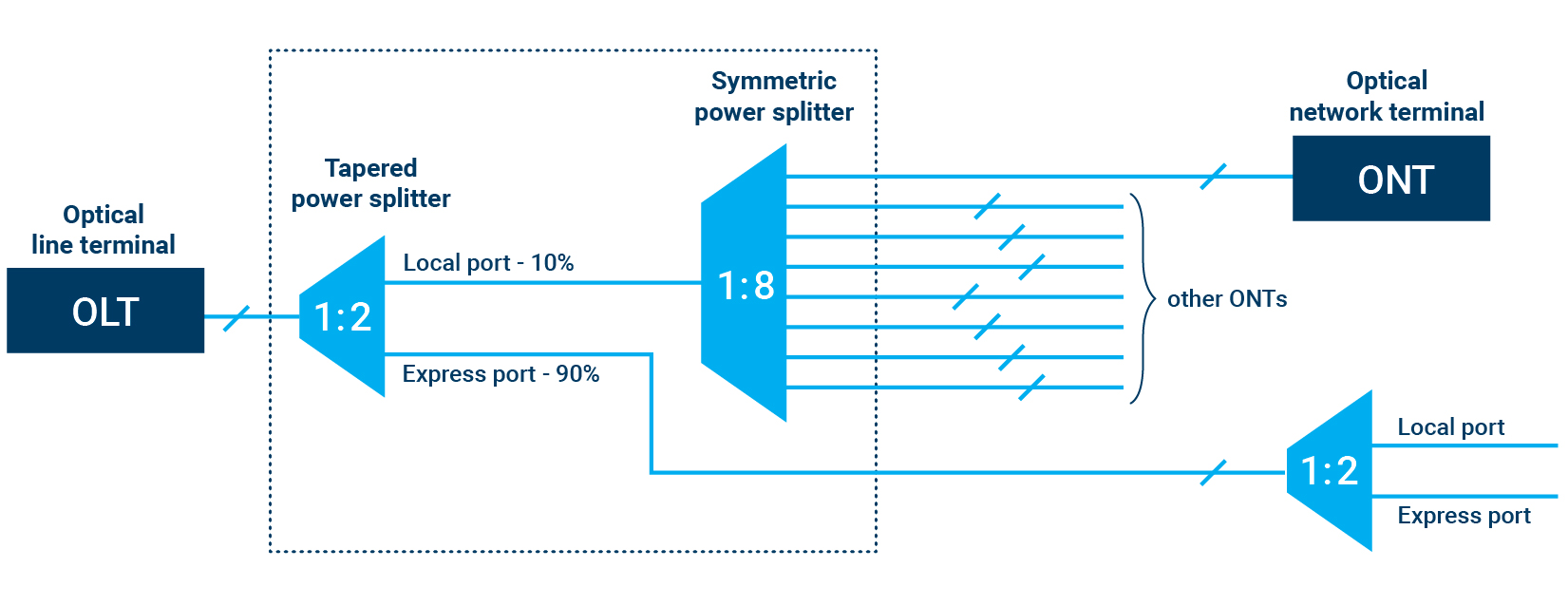 In the example shown, the local port receives 10% of the transmitted light from the OLT, while the express port receives 90% of the input power, preserving as much power as possible for the downstream tapered splitter to maximize reach out to more remote subscribers.