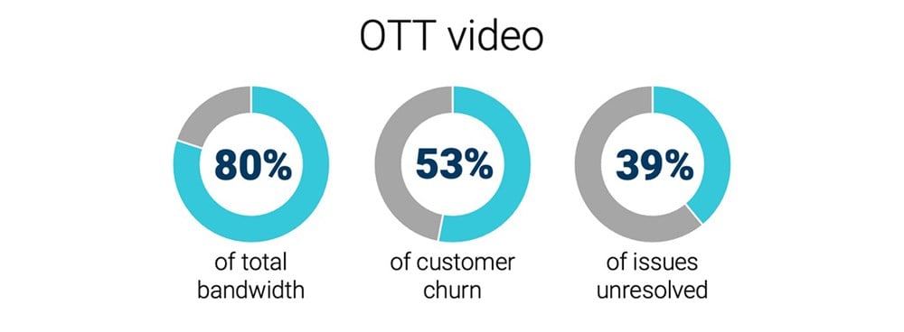 随着OTT视频服务日益普及,它们也带来了一把双刃剑,对有线运营商(CSP)和移动运营商(MNO)来说都是如此。一方面,这些服务促使人们更加渴望甚至愿意付更多的钱来购买带宽更高、性能更好的流量套餐。有个简单的事实可以证明这一点——到20251年,OTT视频服务预计会占所有移动网络流量的近75%1。另一方面,视频体验质量(QoE)差会对运营商的品牌造成毁灭性的影响。视频体验质量在净推荐值(NPS)中所占比例高达53%2,而NPS是一个衡量客户流失的很好指标——NPS越低,客户流失率越高。如果没有合适的工具和可视性,OTT视频传输问题会很快损害您吸引和留住优质客户的能力。事实上,目前有39%的OTT视频问题未得到解决,尽管它们是造成客户流失的主要原因3。